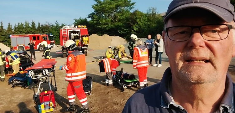 Angenommene Großschadenslage bei einer Katastropenschutzübung des Kreises Nordfriesland: Bei einer Firma, die mit Gas und Öl handelt, brennt eine Lagerhalle. Zu der Zeit hatte sich eine Schulklasse das Unternehmen führen lassen. 13 der Kinder gelten als vermisst. Für die Rettung von Personen und erste Löschmaßnahmen steht kaum Wasser zur Verfügung, weil das stationäre Hydrantennetz in der Umgebung zusammengebrochen ist. Bei einem benachbarten Fuhrunternehmen für Sand und Kies gilt es gleichzeitig drei Szenarien zu bewältigen.