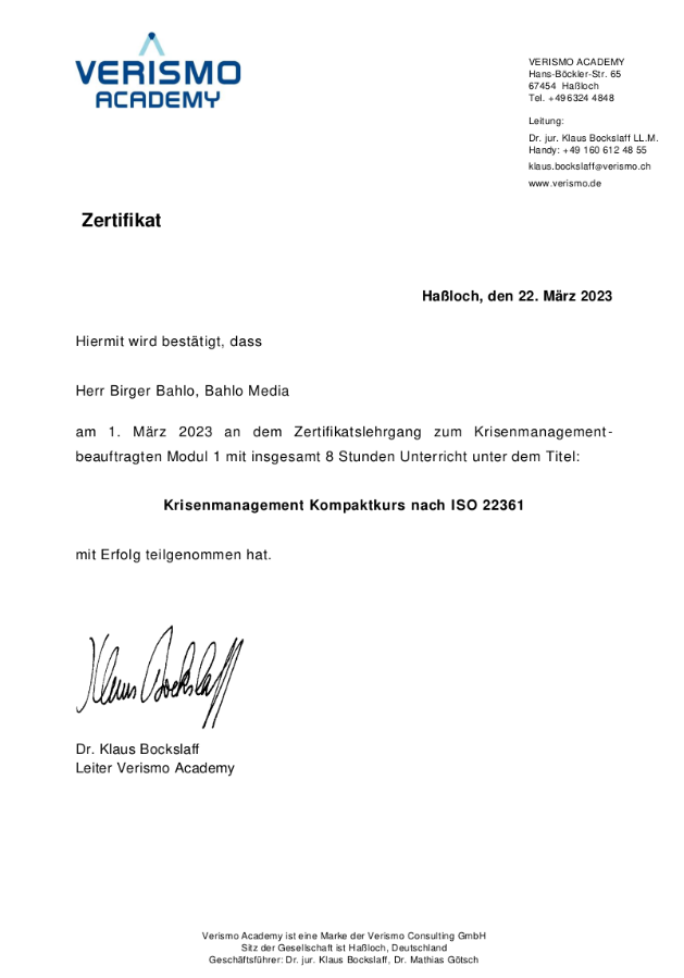 Grundlegende Kenntnisse im Krisenmanagement habe ich mir angeeignet anlässlich einer Fortbildung in der Verismo Academy. Sie unterhält Standorte in Haßloch/Pfalz und Küsnacht/Schweiz. In dem Seminar wurden die Grundstrukturen eines modernen Krisenmanagements vermittelt, auf der Basis der neuen ISO 22361. Dazu zählen die Fachsprache im Krisenmanagement sowie die Funktion und Organisation eines Krisenmanagements - inklusive Abläufen und Verantwortlichkeiten.